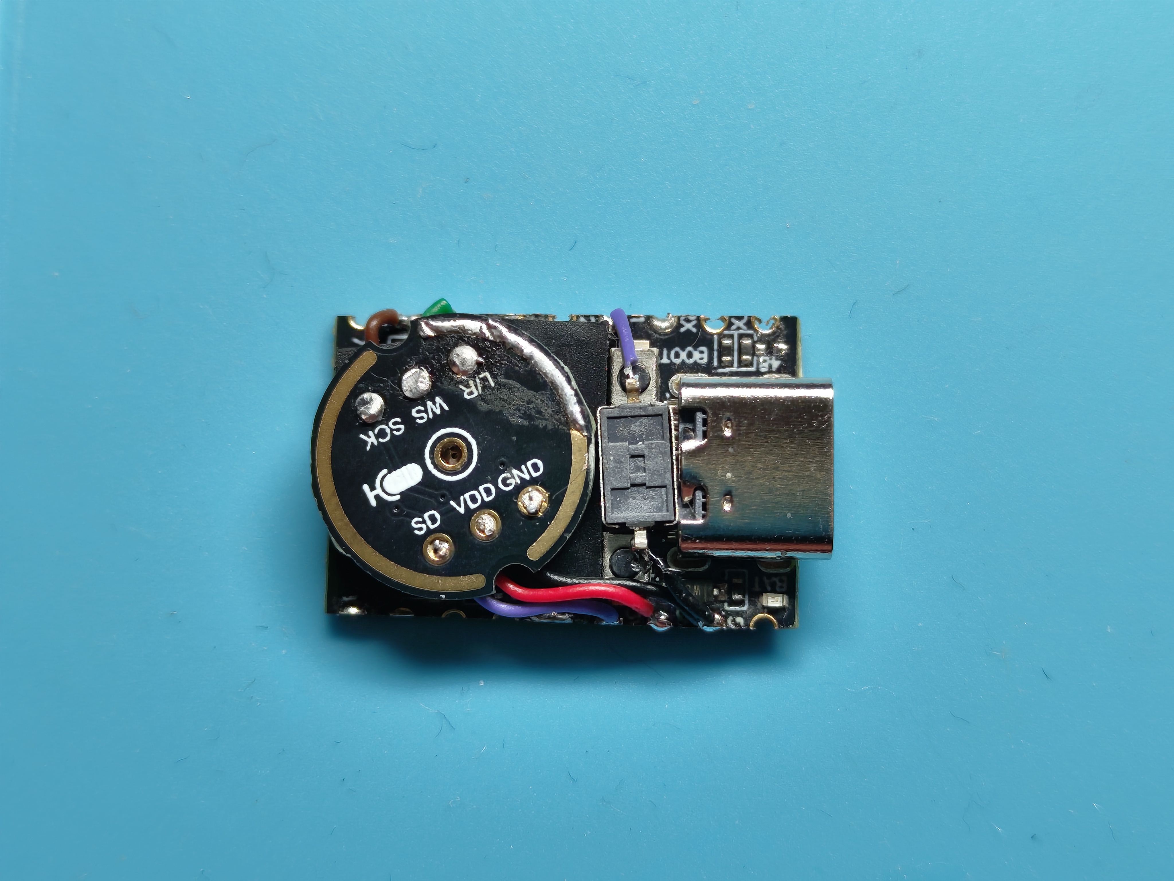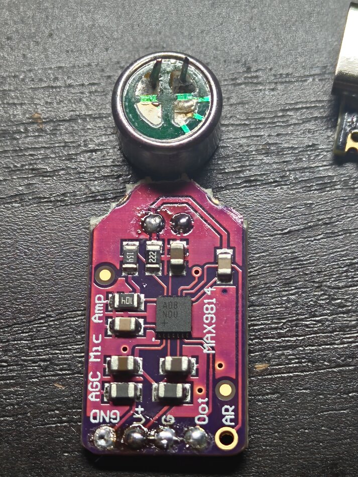 Because I’m too impatient to wait for the slow boat from China, I ordered the same microphone locally. I had to pay an arm and a leg in shipping and impatience fees, but it was worth it, because I finally had a MEMS mic! It’s so cute and tiny, I immediately found a spot for it over the board, added the switch, added a voltage divider for sensing battery voltage, and that was it!